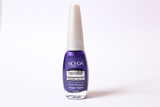 Recebi há algum tempo o esmalte Roxo Chrome que faz parte da "coleção Metálico" da Mohda e desde que vi o vidrinho fiquei maluca para usar, pois adoro esmaltes diferentes.
